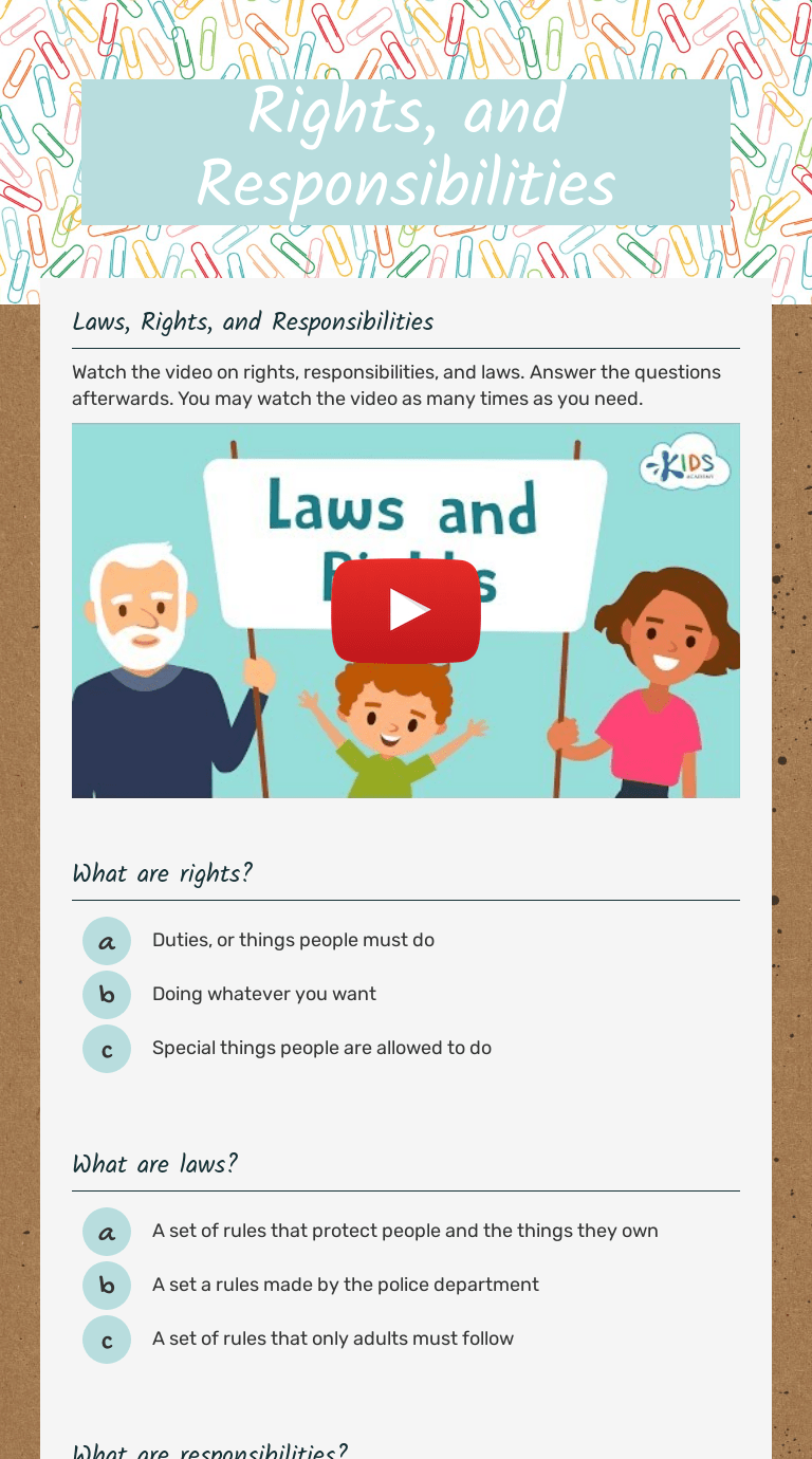 Differentiated worksheets on rights, responsibilities and consequences of not acting on responsibilities. There is also a worksheet students can do to determine rights and responsibilities of classroom citizens. Use this simple and educative worksheet to teach them some of the rights and responsibilities of a citizen. In this lesson, students explore the rights they have at. Students should understand the differences between the rights and the responsibilities of citizens.